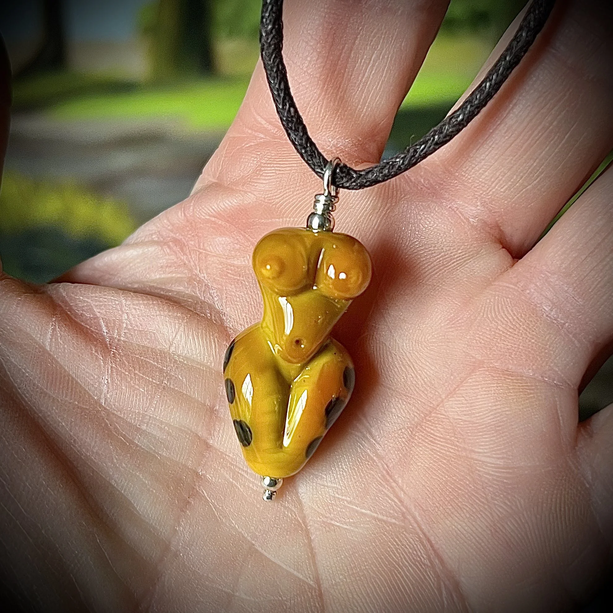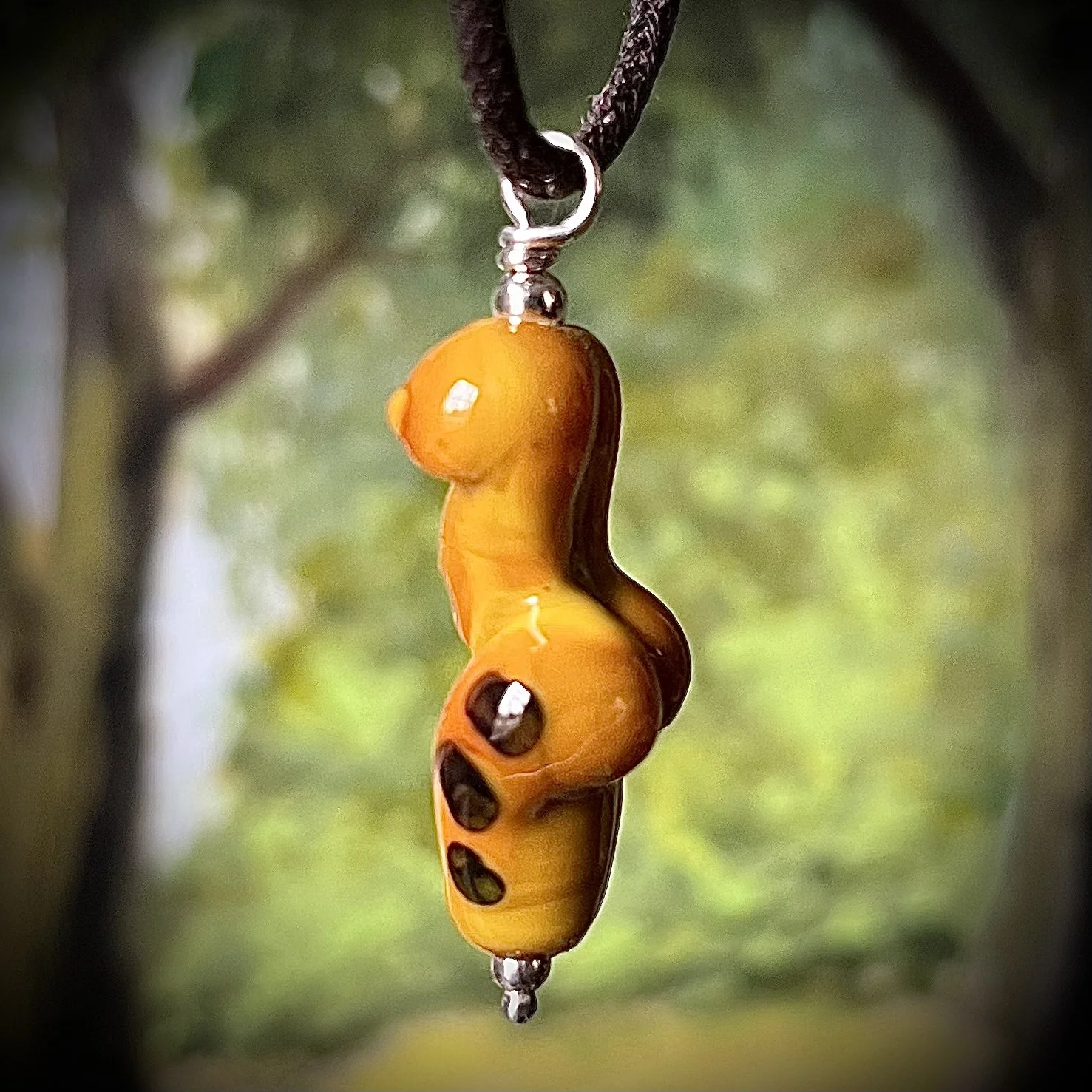 Simple, bold, and captivating. The Saffron Figure Pendant features a gracefully sculpted body form in a brilliant, warm lampworked glass. The intense saffron/amber color is deepened by the intriguing dark spots crafted within the glass. Finished with a clean sterling silver bead and loop, this wearable art piece is perfect for those who appreciate unique craftsmanship and striking silhouettes.